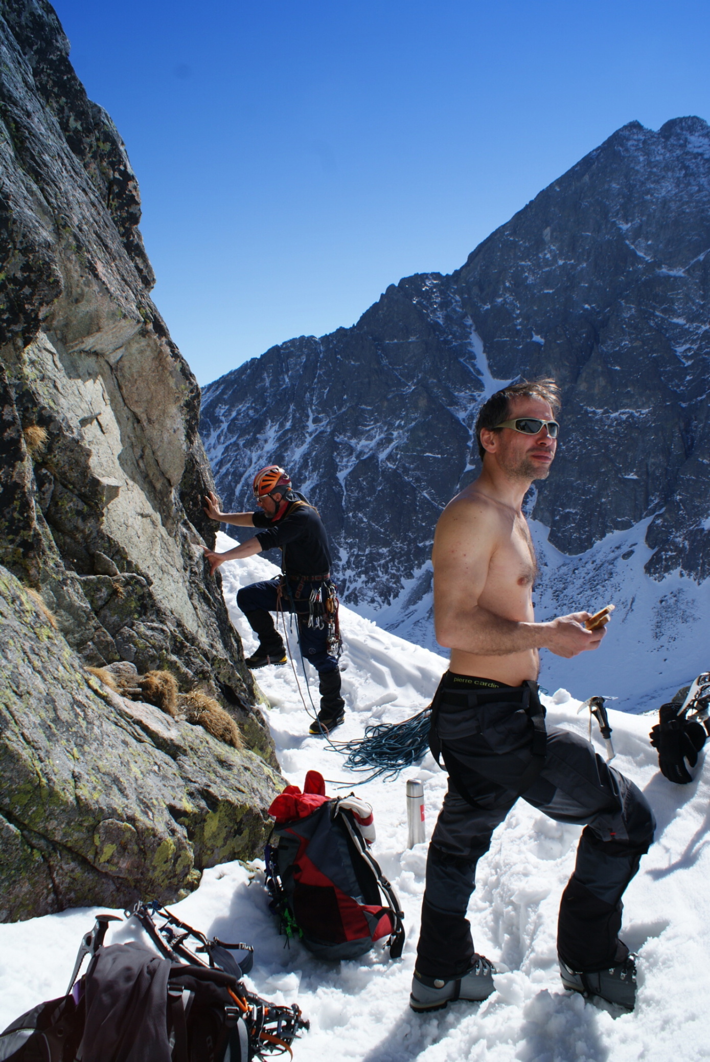 Čepice, to je dost o zvyku. Záleží na podmínkách, jestli zvolit teplejší, každý má rád na hlavě něco jiného. Jen upozorním na 2 věci – neměla by na hlavě při delším nošení svědit (nepříjemné hlavně v noci ve spacáku) a měla by být použitelná pod přilbu (i turisté chodí žlaby a traverzy, kde padá kamení). Dobrým vynálezem jsou multifunkční šátky. Nahradí tenkou čepici, ochrání krk před sluncem atd. Rukavice jsou základ, k omrzlým rukám přijdeme poměrně rychle. Tady bych „cibuli“ nedoporučil, ve více vrstvách jsou obvykle ruce napěchované, což zhorší krevní oběh a přijít k omrzlinám je snazší. Prstové či palčáky? To záleží na podmínkách, co já osobně snesu i na tom, co míním podnikat. Dobrá volba jsou tříprstové, je v nich menší zima proti prstovým, ale mohu fotit či manipulovat s přezkou batohu a karabinou. Ponožky, to je velmi důležitá a hojně podceňovaná záležitost. Lépe jedny dobré, než vrstvit jich vícero. Nebudou se tak po sobě posouvat a způsobovat otlaky. Měly by dostatečně hřát, odvětrávat, tlumit nárazy a sedět bez pootočení na noze. Toho všeho lze dosáhnout při správně zvolené konstrukci s použitím různých materiálů odlišných vlastností. V botě musí zůstat dost volného místa, protože noha působením „horodřiny“ naroste o cca 0,5 cm. A pro úplnost k botám, kožené nebo syntetika? Kůže má nadále své opodstatnění, mj. kožené botky mají delší životnost. Na druhou stranu jsou kapku těžší a faktem je, že 1 kg na noze je jako 6 kg v batohu.