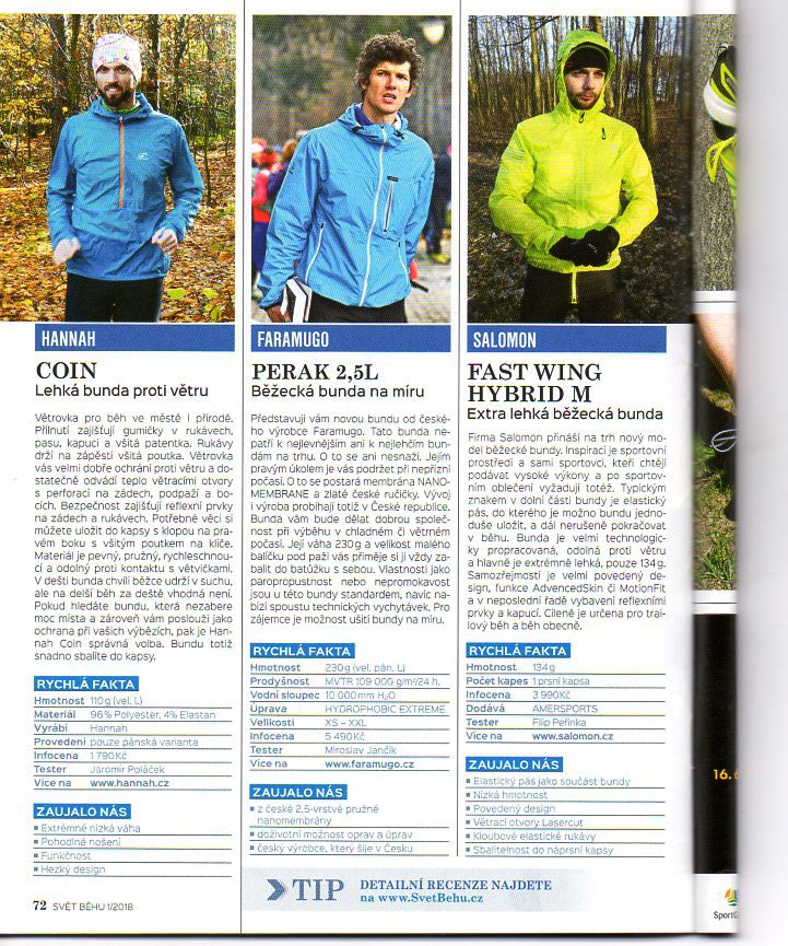 Že jste nikdy předtím neslyšeli o firmě Faramugo? To nevadí, já také ne. Mladá firma (nebo čtyři roky stará, jak chcete) má ale bohaté zkušenosti a rozhodně má co nabídnout. Jejím heslem je „Nešijeme pro lidi, šijeme pro člověka“. Když se nad tím člověk zamyslí, tak je jasné, co tím básník chtěl říci. Teď si něco povíme o jejich nanomembránové větrovce Perak.Bunda mi přišla v pěkném bílém, malém pytlíčku. Velikost akorát pod paži, případně se dá složit do kapsy, ale to už je dost. V balíčku byl i papír, jak se k bundě chovat a co rozhodně nedělat pokud chceme, aby bunda vydržela co nejdéle. Ne že bych to nevěděl, ale rozhodně to bylo příjemné malé překvapení.Teď už k samotné bundě. Na první pohled se bunda moc neliší od běžných větrovek. Pak člověk zaostří na malou chobotnici na pravém rameni a začne si všímat dalších vychytávek.Vidět a být viděn je při sportu důležité, zde tomu pomáhají voděodolné reflexní zipy a jeden vodorovný reflexní pruh na zádech. Dále má bunda rukávy kolem zápěstí stažené gumou. Gumový lem je i na spodku bundy po celém jejím okraji. Prodloužená záda jsou umně zamaskovaná, že si jich ani nevšimnete. Též si nevšimnete větracích otvorů, které tam ale doopravdy nejsou. Nechybí a ani nejsou třeba. Větrací otvory v tomto případě zastupují kapsy, které jsou pouze se síťoviny, aby zbytečně nezvyšovaly hmotnost bundy a mohly plnit i tuto funkci. Bunda má tři kapsy. Dvě na ruce a jednu na hrudi. S přilbou na hlavě se pod kapuci nedostanete, ale bez ní vám vykouzlí na hlavě příjemný komfort se zpevněným kšiltem. Kapuce se pohodlně šteluje na třech místech, takže padne každému. Pokud vás kapuce nudí, můžete si ji pomocí poutka srolovat, aby vám neplácala jen tak na zádech.Bunda je vyrobena z české 2,5 vrstvé pružné nanomembrány NANOMEMBRANE. Je to trochu krkolomný název, ale vězte, že tato bunda má ve vínku vlastnosti, které ji řadí do užší špičky běžeckých bund. Materiál je pružný a pokusí se vám co nejvíce přizpůsobit při vašich pohybových kreacích. Díky úpravě HYDROPHOBIC EXTREME voda po látce steče, nešpiní se, a tudíž není potřeba bundu tak často prát. Pro lidi zajímající se o ochranu přírody jistě zaujme fakt, že tato úprava je ekologicky šetrná (bez použití vody a škodlivého PTFE). Zároveň svou paropropustností MVTR 109.000 g/m2/24 h. bunda nepotřebuje žádné větrací otvory a vy se v ní budete cítit skvěle. Všichni ještě rozumíme vodnímu sloupci (voděodolnost), který je u této větrovky 10 000 mm. Což je na nějaký kratší deštík úplně dostačující a netřeba více. V materiálu a technologii této chobotnice se skrývá ještě 100% větruodolost, 8/8 oleofobita a 5/5 vodoodpudivost. Skoro 100% ochrana všude, ale před pádem ze stráně mě nezachránila.